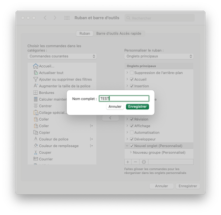 In Excel for Mac (latest version 16.98), I've created a new tab in the ribbon to put my custom macros in a new group. But I can't change the name of the tab, which remains "New tab", nor the name of ...