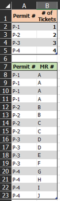 I’m looking for a way to count the number of Permit #s in the lower table—but only once per unique MR #, then put that count in the # of Tickets column in the top table. The numbers in bold show my desired result, based on the data in the lower table. I just canʼt pin down a formula to make this work.