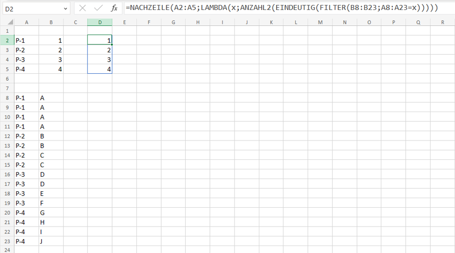 =LET(range2, B8:B23, BYROW(A2:A5, LAMBDA(r, SUM(N(COUNTIFS(A8:A23, r, range2, UNIQUE(range2))>0)))))- kskyllingmarkCopper ContributorSOLVED!! Thank you so much! I donʼt need to do the result spill because itʼs within a table so it automatically fills down. Might experiment with that as well though, someday.