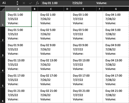 =IF(MOD(COLUMN(A:A),2)=1,CONCATENATE(A$8," ",TEXT($J1,"h:mm"),CHAR(10),TEXT(A$9,"M/TT/jjjj"),CHAR(10),"volume:"),"")Maybe with this formula. You can enter the relevant data in rows 8 and 9 and in column J. I've entered the formula in cell A1 and copied across range A1:G6.