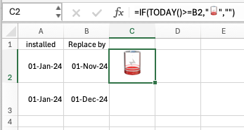 I'm on a Mac now and found the empty battery symbol. I'm pretty sure Excel for the PC has a similar one. Personally I wouldn't bother and just color the 'Replace by' cell red if the day is on or before TODAY()