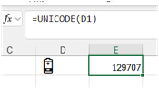 So, an almost empty battery symbol has the UNICHAR value of 129707 in Excel for the PC. And that code works also on the Mac, producing the symbol shown in the first screenshot.