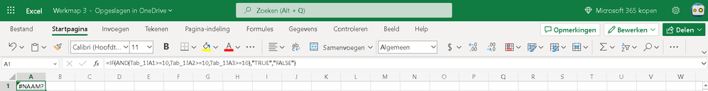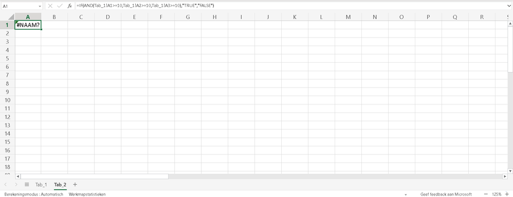 So far I've tried this formula: =IF(AND(Tab_1!A1>=10,Tab_1!A2>=10,Tab_1!A3>=10),"TRUE","FALSE"). But it gives output "#NAME?".