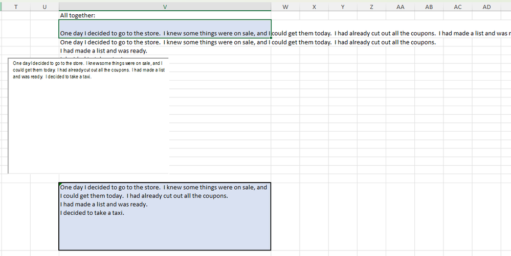 And then in the upper blue box the wrap text is off and you can see how it just spills to the right and does NOT respect the chr(10) line break.