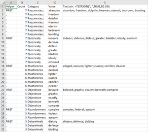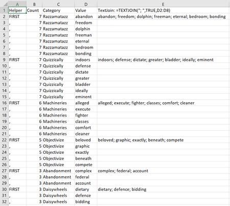 I'd appreciate some advice on how to use the information in the 'count' or 'helper' columns (in the image below) to automatically set the end row of the textjoin formula so that I can create the info...