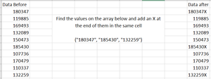 and the results for the cells with "X" added need to be on the same column. So if the value on C1 was 107025, after the macro it would be 107025X.