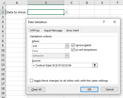 For an example, see the attached workbook. Worksheet KPHX contains daily temperature and precipitation data recorded at Phoenix, Arizona. (I've included only the data since December 2022, as that's what I have at hand.) On worksheet Control Data, a set of formulas builds the text to show in the dropdown list on cell B2 of worksheet Subset. I used just part of the generated list to set up data validation for cell B2 via menu items Data → Data Tools → Data Validation → Data Validation…On worksheet Subset, formulas in cells B3 and C3 calculate the start date(-time) and end date(-time) for formulas on that sheet, respectively. (These values do not have to be visible.) You did not indicate if your historical data is recorded with dates only, or if it is recorded with dates and times. I included 11:59:59 PM in the calculation of the end of the month (cell C3), and that will handle either case.