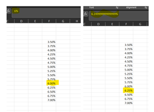 I create a pattern to fill down. The pattern starts with 3.50%, in the next cell 3.75%. I select both cells and then use the copy/fill tool to copy down to 7.00%. After the fill, when I click on 6...
