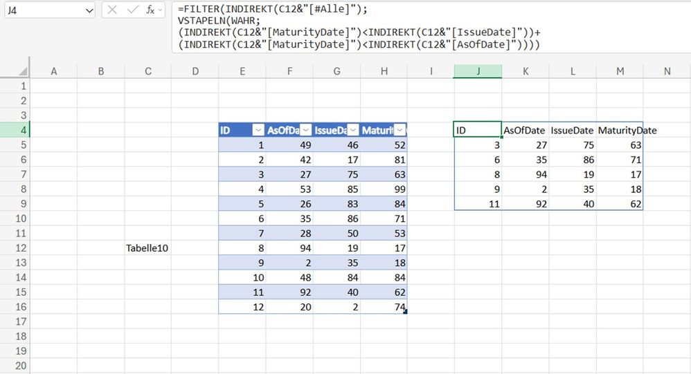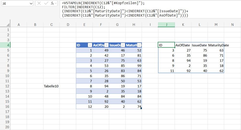 =VSTACK(INDIRECT(C12&"[#Headers]"), FILTER(INDIRECT(C12), (INDIRECT(C12&"[MaturityDate]")<INDIRECT(C12&"[IssueDate]"))+ (INDIRECT(C12&"[MaturityDate]")<INDIRECT(C12&"[AsOfDate]"))))I'd suggest to filter the bottom of the table (without the headers) and then vertically stack the headers and the result of the filter as shown with the second formula and screenshot.