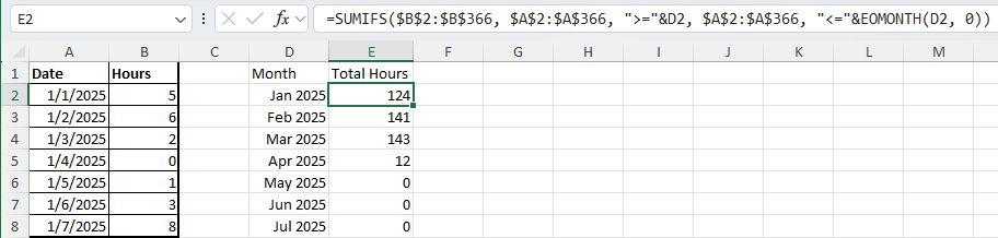 =SUMIFS($B$2:$B$366, $A$2:$A$366, ">="&D2, $A$2:$A$366, "<="&EOMONTH(D2, 0))