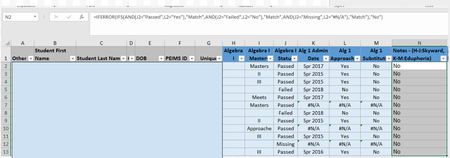 =IF(AND(A1="Passed",B1="Yes"),"Match",IF(AND(A1="Failed",B1="No"),"Match",IF(AND(A1="Missing",B1="N/A"),"Match","No")))