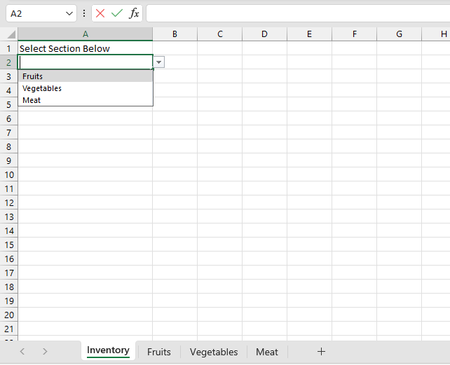 =IF( A2="", "", FILTER( INDIRECT("'" & A2 & "'!C3:D14"), INDIRECT("'" & A2 & "'!C3:C14")>"", "nothing" ) )(The apostrophes handle the case where the worksheet name includes a space or special character. The FILTER function prevents rows with empty cells in the non-Inventory worksheets from being included.)