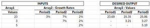 The final formula uses MAPλ. The calculation is the same as 3. (above) but the process of forming and stacking thunks is hidden from the user. This helper function does some pre-processing of the user-specified function before passing it in modified form to the in-build MAP helper function. Each time the modified function is applied, it first applies the original user-function and then converts the result to a thunk. Once MAPλ has run through the recursion it will have generated an array of thunks. As before, EVALTHUNKARRλ will evaluate each thunk within the array and stack the results appropriately.