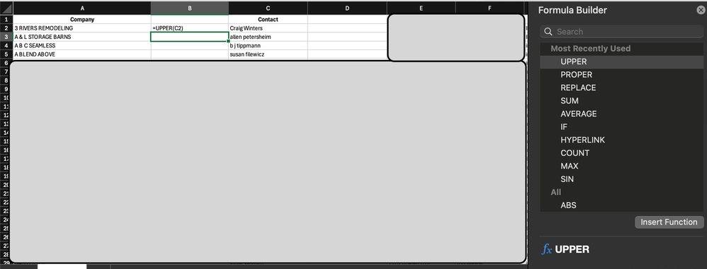I am trying to use the UPPER function on my Excel sheet. I was able to format my first column, but when I try the next column, it won't convert. I have tried several times, and it will not convert the function. I have included two screenshots to show the progression. I formatted the column to text, and have tried to troubleshoot any tips I have come across. I have tried both on my desktop and uploaded to my 365 and both have the same result. What am I missing?