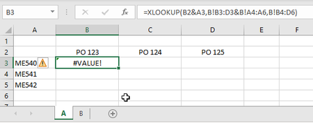 =XLOOKUP( $A3, B!$A$3:$A$5, XLOOKUP(B$2, B!$B$2:$D$2, B!$B$3:$D$5) )