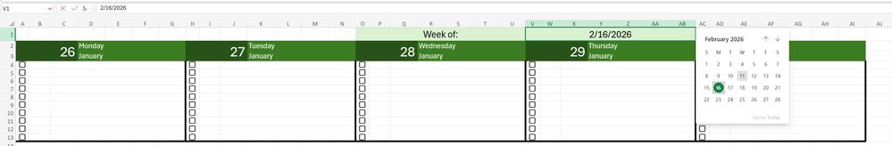 Hello, we are working on a really simple delivery schedule for Monday thru Friday. The top row has a cell that is formatted as a short date picker. In choosing a date in that cell, I would like the dates of the 5 numbered cells below for each day of that week to be updated based on the date chosen. For instance, I chose 2/1/26 in the date picker. I would like cells A2, H2, O2, V2, and AC2 to correlate to that date number and automatically populate the proper day of the month. If possible, it would be great if the month names that are in cells D3, K3, R3, Y3, and AF3 would also correlate and update properly.