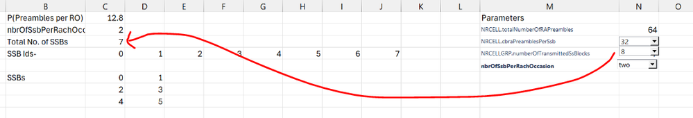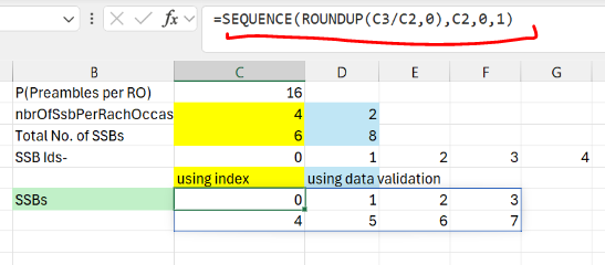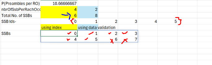 Total No. of SSBs =6, then , for nbrOfSsbPerRachOccasion ==4, we should have 2 rows (roundup 6/4), but the max num of SSBs <= Total no of SSB which is 6 here, so in below 0,1,2,3,4,5 are ok and 6 and 7 should not be printed( from C6 to F7 in below case) how to achieve that.