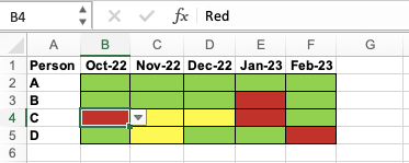 8. The new table will be generated with a count for each month that contains a value of “Red” and the “Person(s)” for which this applies.