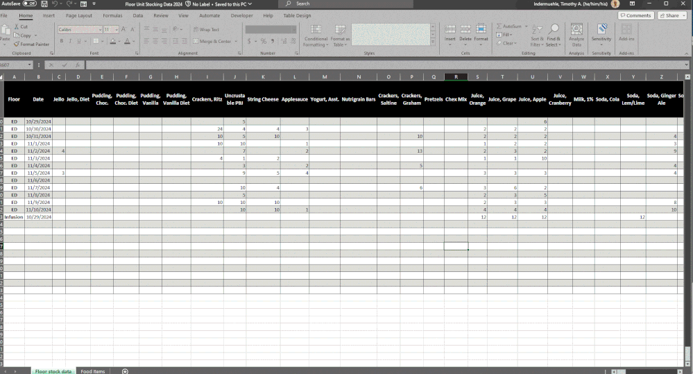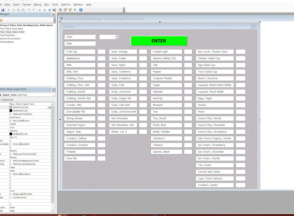 I'm using Office 365 for Windows on a federals government computer system. I track the food and beverage inventory that is stocked from 11 floors and units in a hospital. I had to consolidate it onto one table and complicated me entering data easily. I created a form using Excel VBA to in put data onto a spreadsheet labeled Floor stock data. There are no values assigned to the entry cells.