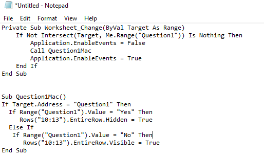 Private Sub Worksheet_Change(ByVal Target As Range) HandleQuestion "Question1", "A10:A13" HandleQuestion "Question2", "A15:A18" HandleQuestion "Question3", "A20:A23" ' ... End Sub Private Sub HandleQuestion(q As String, r As String) If Not Intersect(Range(q), Target) Is Nothing Then Application.ScreenUpdating = False Application.EnableEvents = False Range(r).EntireRow.Hidden = (Range(q).Value = "Yes") Application.EnableEvents = True Application.ScreenUpdating = True End If End SubIf all questions have a range named Questionn and if the rows to be hidden follow a fixed pattern, this could be streamlined even further.