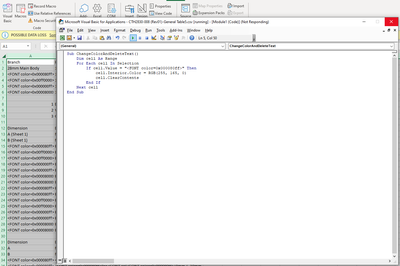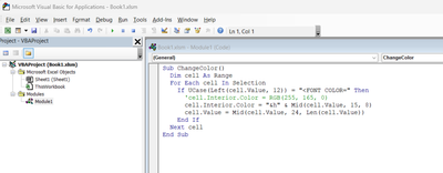 Sub ChangeColor() Dim cell As Range For Each cell In Selection If UCase(Left(cell.Value, 12)) = "<FONT COLOR=" Then 'cell.Interior.Color = RGB(255, 165, 0) cell.Interior.Color = "&h" & Mid(cell.Value, 15, 8) cell.Value = Mid(cell.Value, 24, Len(cell.Value)) End If Next cell End Subalso, make sure you add a module and put the code into a module instead of the worksheet or workbook pages. Open the Project window if not open, right click and add module: