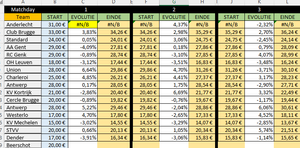 Hello, I'm doing a search to find the % that belongs to a team ( fe Anderlecht) coupled to a matchday (fe 1) (table 1 => looking to fill cell N/B marked in yellow) The data comes out of sheet 2...