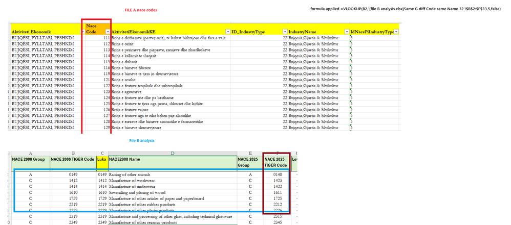 There are 616 rows in file A nace codes while in file B there are 32. When I apply the vlookup formula to find which of these 32 records from file B analysis are found in file A nace code i get no results (always #N/A). I have tried changin the format of the columns still the same results in order to have the same format but still the same results