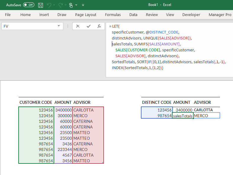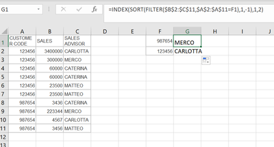 Given the 'CUSTOMER CODE' with multiple 'SALES' I would like to return the 'SALES ADVISOR' with the best/max 'SALES' value.