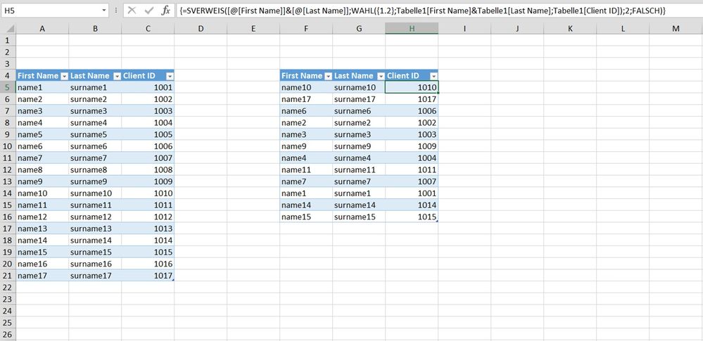 =VLOOKUP([@[First Name]]&[@[Last Name]],CHOOSE({1,2},Tabelle1[First Name]&Tabelle1[Last Name],Tabelle1[Client ID]),2,FALSE)This formula works in my sheet. The name of the left table is Tabelle1 in my sample.