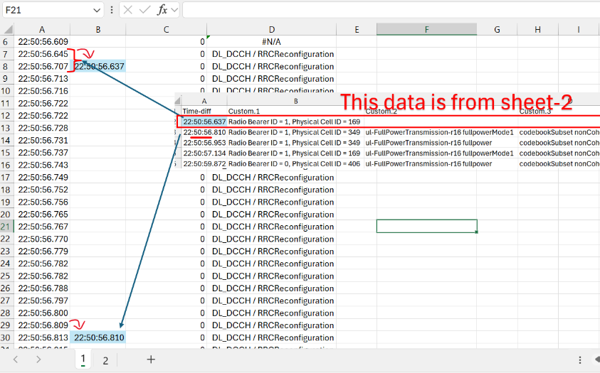 so, I keep it after 22:50:56.645, in column B, and so on..22:50:56.707
