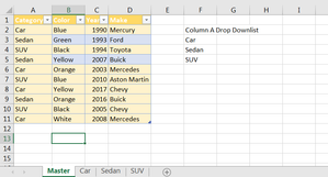 I am trying to search drop down column A in the Master sheet, match data and then pull that data's row into the corresponding sheet (car, sedan, suv).