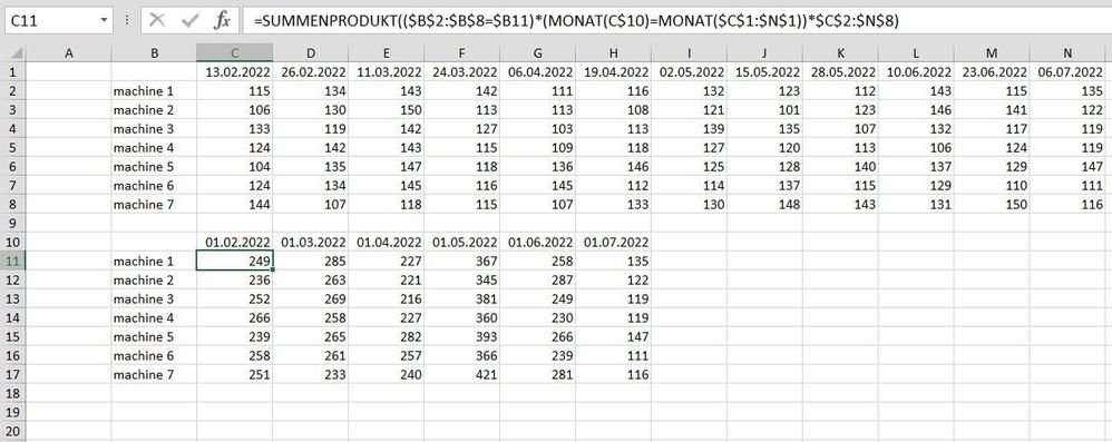 What i'm trying to do is get a formular that will look across all 7 machines and individually total my material usage by month.