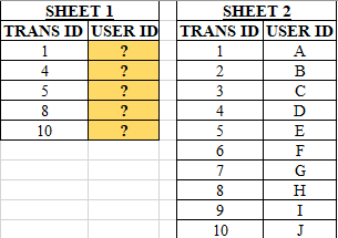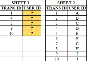 I need a formula to pull associated data from one sheet to another sheet. Ex: Sheet 1 has Transaction ID. Sheet 2 has a Transaction ID and a User ID. I need to only pull in certain User IDs from S...