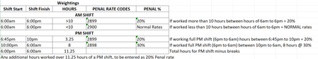 As is often the case with Excel, there would be several different ways to resolve this kind of situation, several different ways to write formulas, several different ways to minimize laborious entry tasks. Rather than just give you a simple formula [e.g., =IF(code=2899,base_sal*1.2,base_sal) ] it really would help us help you if you described who is entering the start and finish times, whether you expect the computer to calculate how many hours were worked and determine what code applies, or will whoever enters this data also be entering the relevant code?