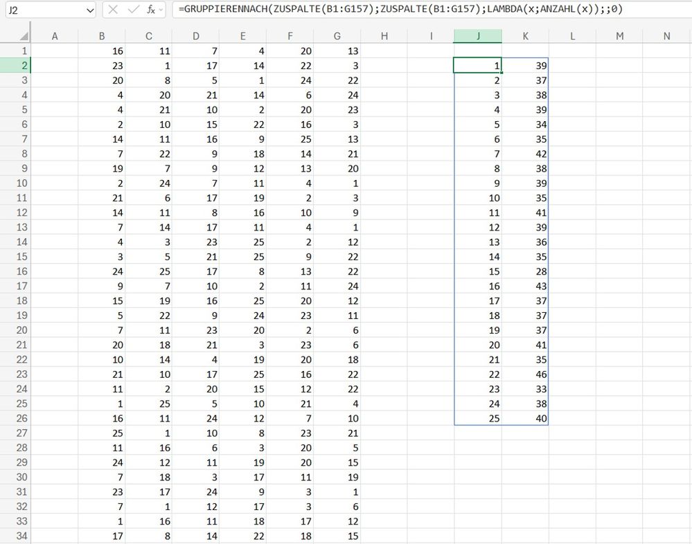 =GROUPBY(TOCOL(B1:G157),TOCOL(B1:G157),LAMBDA(x,COUNT(x)),,0)