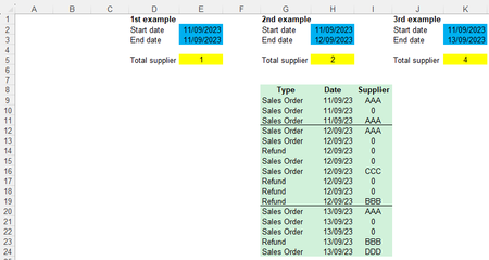 Hi all, Which formula should I use to count the number of suppliers excluding duplicates and using the date filters highlighted in blue? The result for each example should be the numbers highlighte...