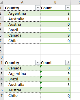 The @ sign combined by the column name fixes the reference to the Country on the same row. If you don't do that, the direct reference will follow the the cell when it moves after a sort, as shown in the picture.