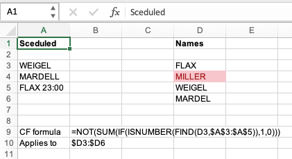 =NOT(SUM(IF(ISNUMBER(FIND(D3,$A$3:$A$5)),1,0)))- eanastasioCopper ContributorI attached the Conditional Formatting picture and I am using version 365 MSO (Version 2202 Build 16.0.14931.20648) 32-bit