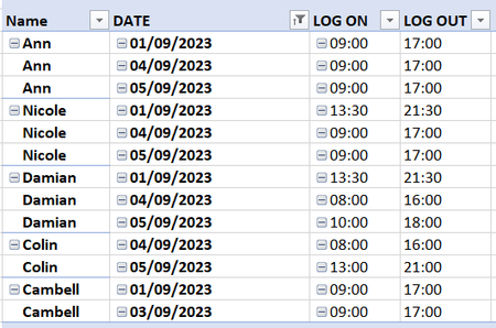 mtarler thanks for those suggestions, I will give them a try. I have tried a pivot table, but the issue is that I want the log on times to be horizontal, and the names and dates vertical. The pivot table will only allow all to be vertical e.g.