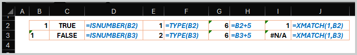 Range B2:B3 is in Genera format, in B2 we have number 1 and in B3 text '1. ISNUMBER() and TYPE() show them accordingly.