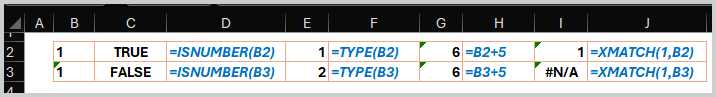 Convert text to number we could by formula which assumes number type as argument. In Excel auto-lifting (coercion ) rule works - if function assumes number as argument and have a string as input, it parses such string into number and tries to calculate again. If parsing works result as with number is returned, otherwise an error. Lookup functions like XMATCH work with data types as they are without coercion. In above example formatting doesn't affect the result.