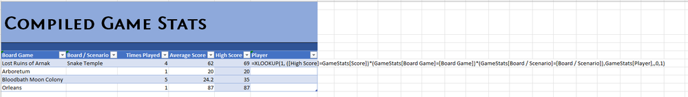 =XLOOKUP(1,(CompiledGS[@[High Score]],GameStats[Score])*(CompiledGS[@[Board Game]],GameStats[Board Game])*(GameStats[Board / Scenario],CompiledGS[@[Board / Scenario]]),GameStats[@Player],,0,1)