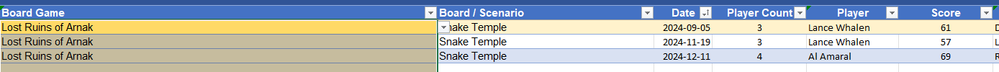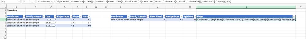 I am setting up a workbook for boardgames played for someone and he wants to see the high score returned for each game. I have tried xlookup in multiple ways and have had no success.