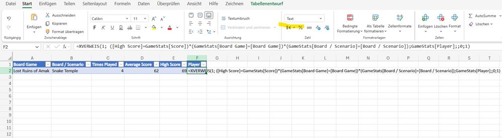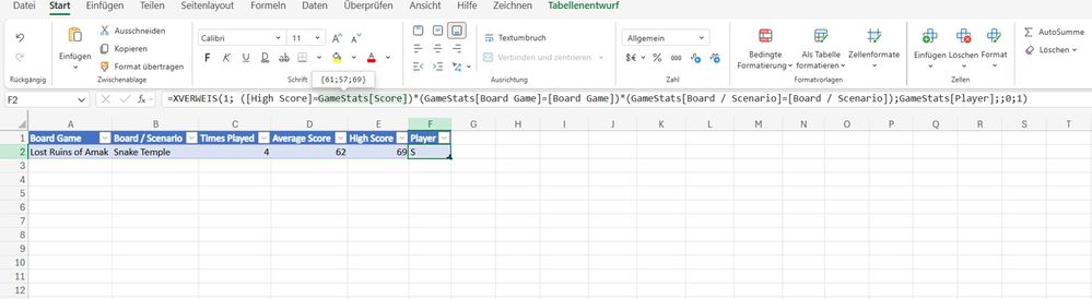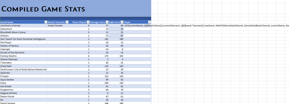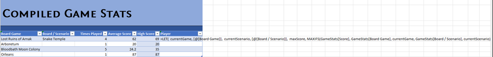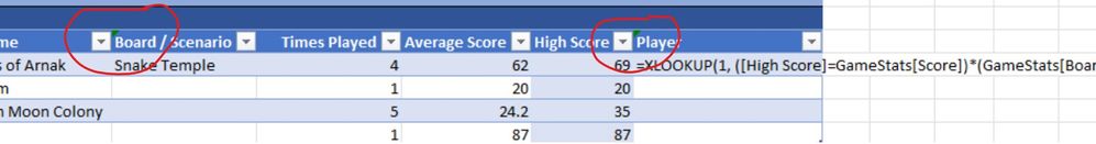 =XLOOKUP(1, ([@[High Score]]=GameStats[Score])*(GameStats[Board Game]=[@[Board Game]])*(GameStats[Board / Scenario]=[@[Board / Scenario]]),GameStats[Player],,0,1) - Olufemi7Iron Contributor
