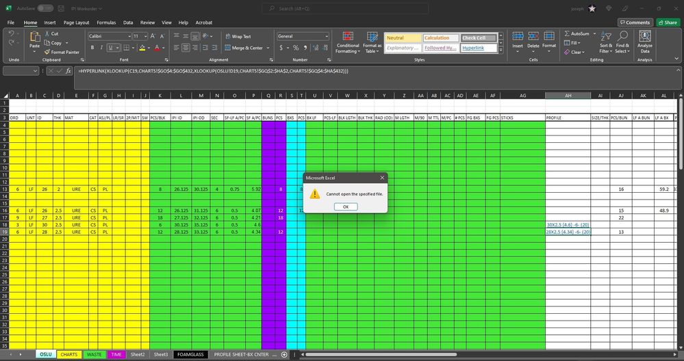 I have a spread sheet named "One Size Look Up (OSLU)" that can return numerous values of a certain criteria with XLOOKUP functions. I am trying to format a cell, in OSLU, to return a hyperlink to a local file on my PC that would route me to the criteria's profile. The hyperlink is located on a separate spread sheet named "CHARTS" within the same workbook. I have wrapped my XLOOKUP in a hyperlink formula and it returns the error message "CANNOT OPEN THE SPECIFIED FILE". The hyperlink opens correctly in its originated spread sheet, CHARTS. The return value of the XLOOKUP, wrapped in the hyperlink formula, does not. Any ideas?