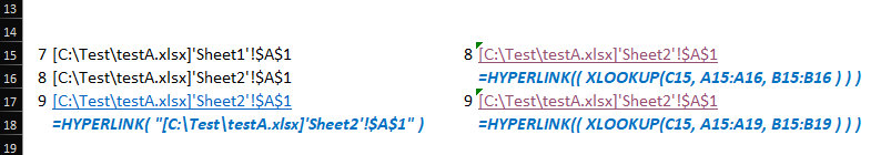 As an example, if my current file is on OneDrive and target file is local drive, link returned as '[C:\Test\testA.xlsx]Sheet2'!$A$1 forwards on OneDrive, [C:\Test\testA.xlsx]'Sheet2'!$A$1 opens local file and focuses on right place.