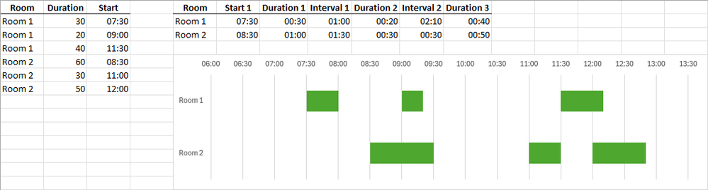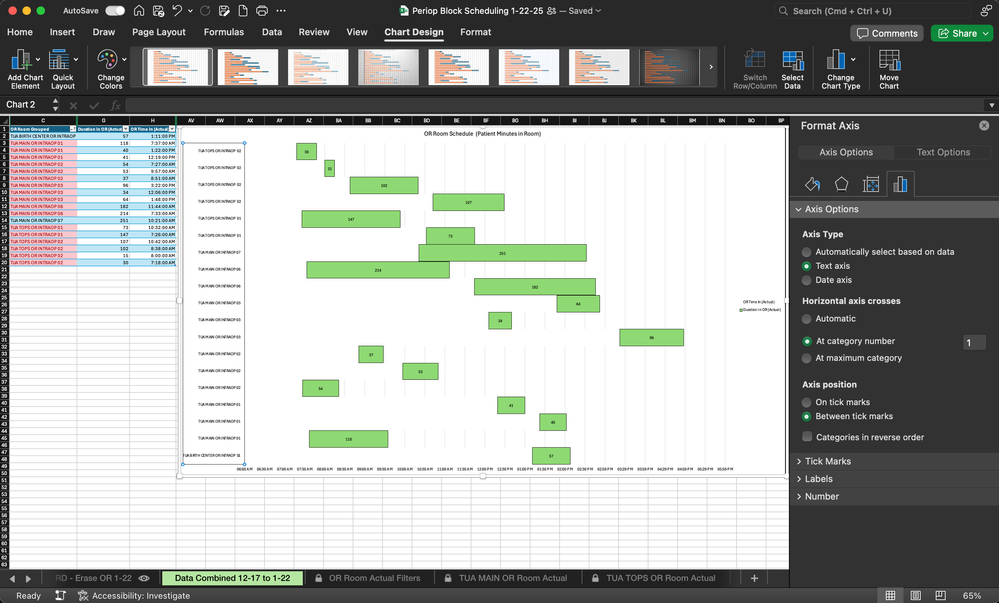 Hi there, I am working on creating a block schedule chart, you can see the table at the top left and what my chart looks like right now. The y-axis represents a different room. I want the block schedule to overlay rooms so that there are multiple blocks in the same row. For example, TUA TOPS OR INTRAOP 2 would have the 4 blocks displayed on the same row.