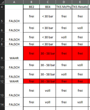Leider passiert das aber nicht. Um mein Problem nachzuvollziehen, habe ich einen Auszug als Excel angehängt. Ändert man eine Zeile so, dass sie einer anderen entspricht, sollte rechts Wahr stehen und die entsprechenden gleichen Zeilen färben sich. Funktioniert nur nicht bei den Zeilen mit "< 30 bar".