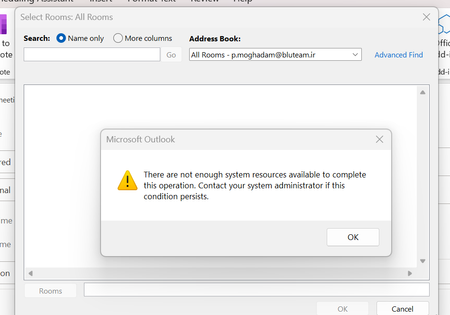 hello, When client open new meeting in outlook and then location, all rooms can not display and the error is there are not enough system resources available to complete this operation. ...