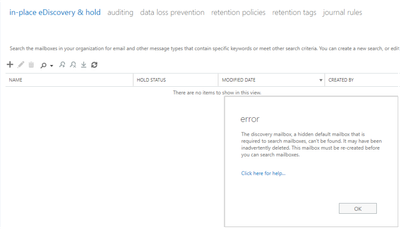 The discovery mailbox, a hidden default mailbox that is required to search mailboxes, cant found. it may have been inadvertently deleted. This mailbox must be re-created before you can search mailboxes.